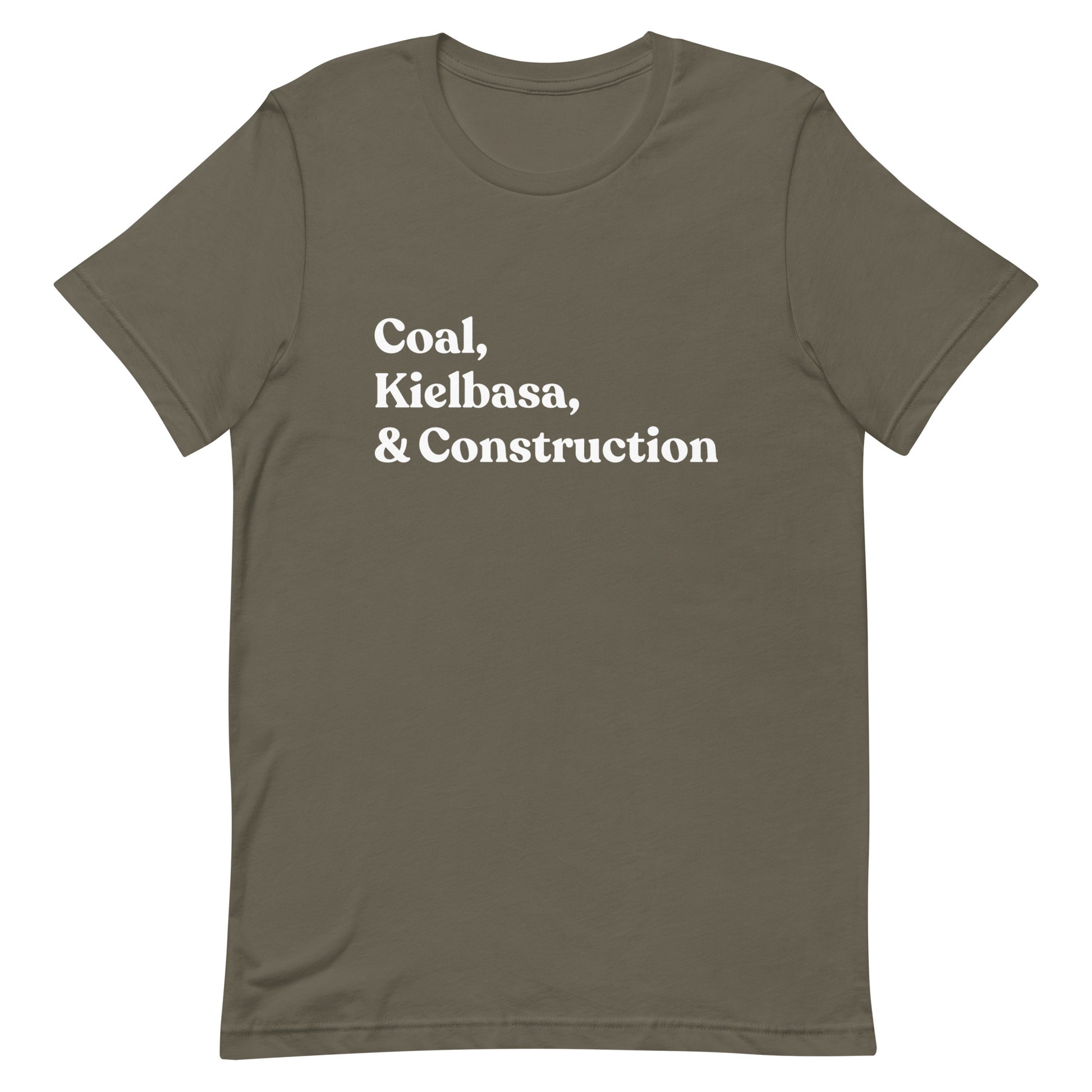There's more to this state than pizza, potholes, & pierogies. We've also got coal, kielbasa, and construction. The Coal, Kielbasa, & Construction Tee is tapered fitting, super soft and lightweight, with the perfect amount of stretch. Made from pre-shrunk, combed and ring-spun cotton available in Mauve, Navy, Steel Blue, and Army.